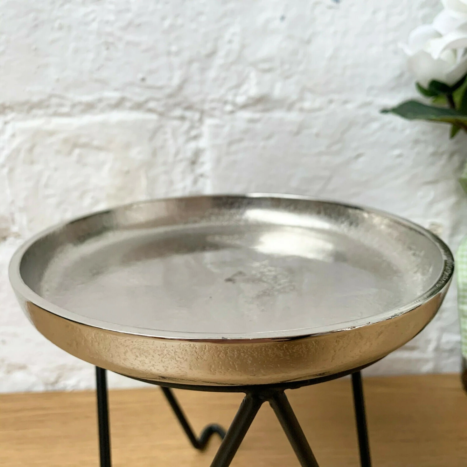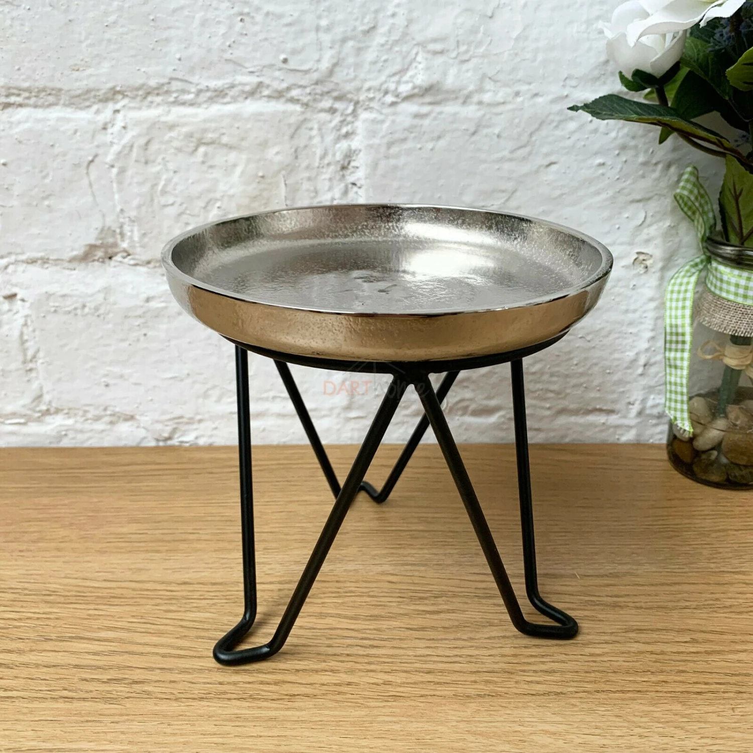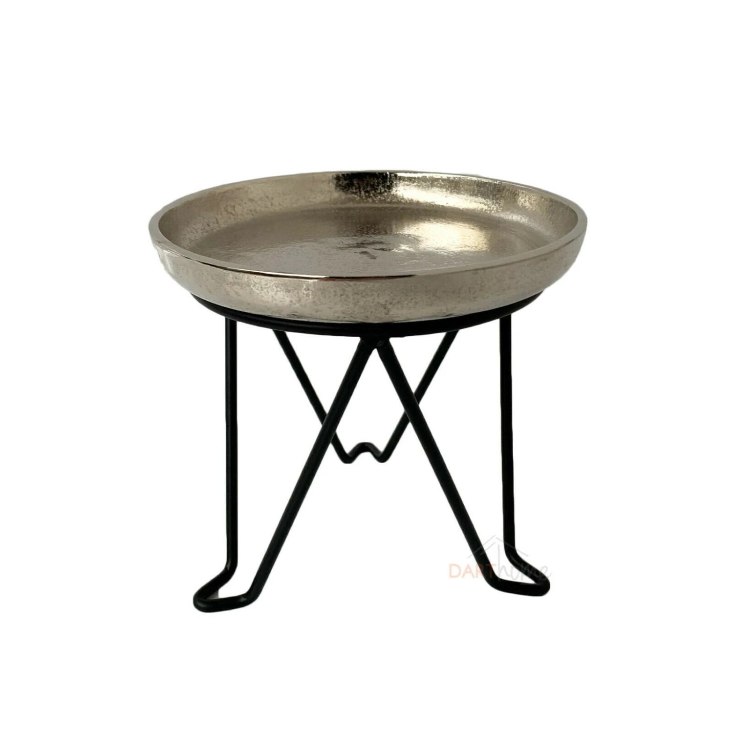 - Features: Black Three Leg Stand, Round Plate, Distressed Textured Silver, Indoor, Freestanding