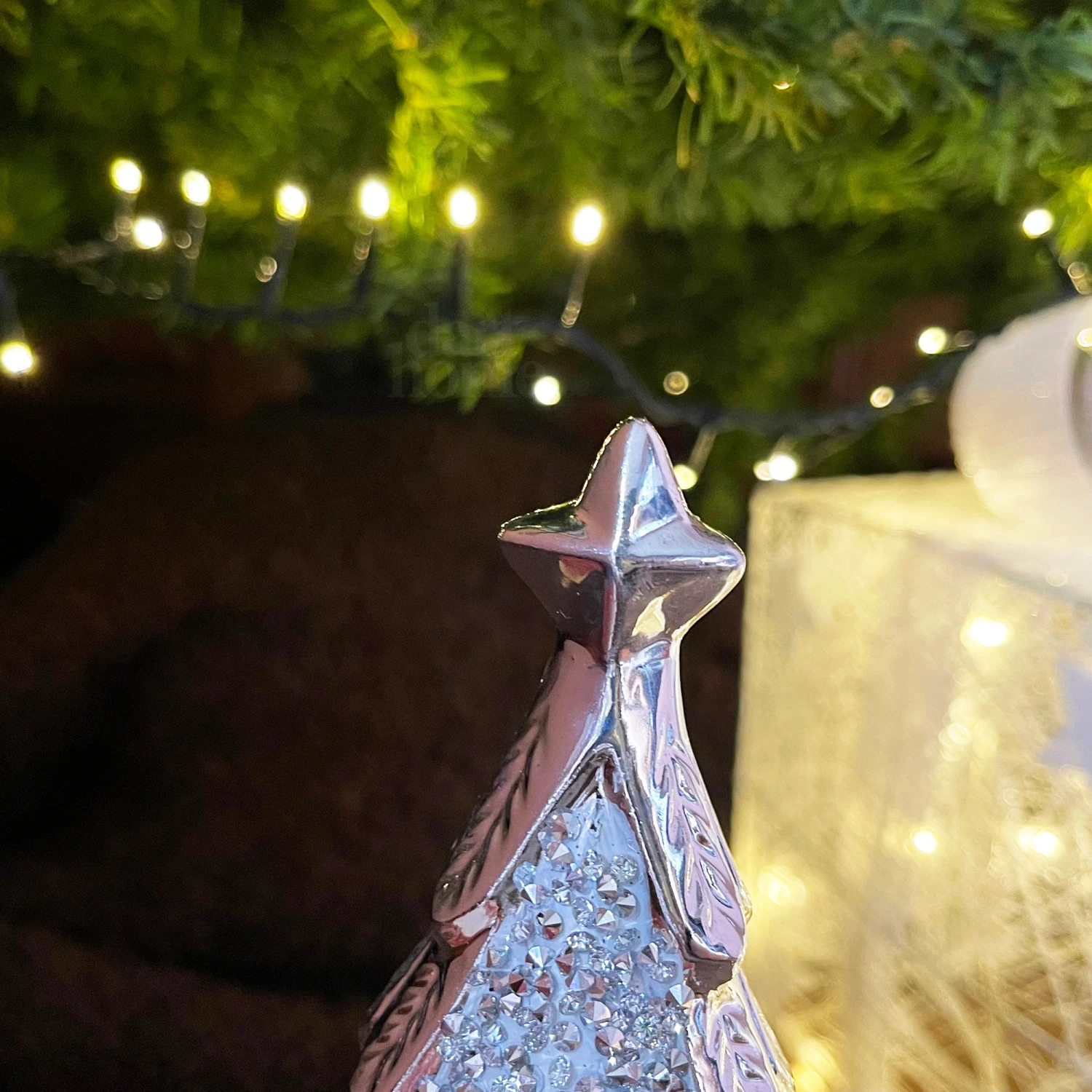A beautiful modern twist to a classic christmas tree figurine design. Hammered effect ceramic ornament with a chrome silver finish. This little figurine is a stunning shelf sitter that will add colour to your christmas setting.