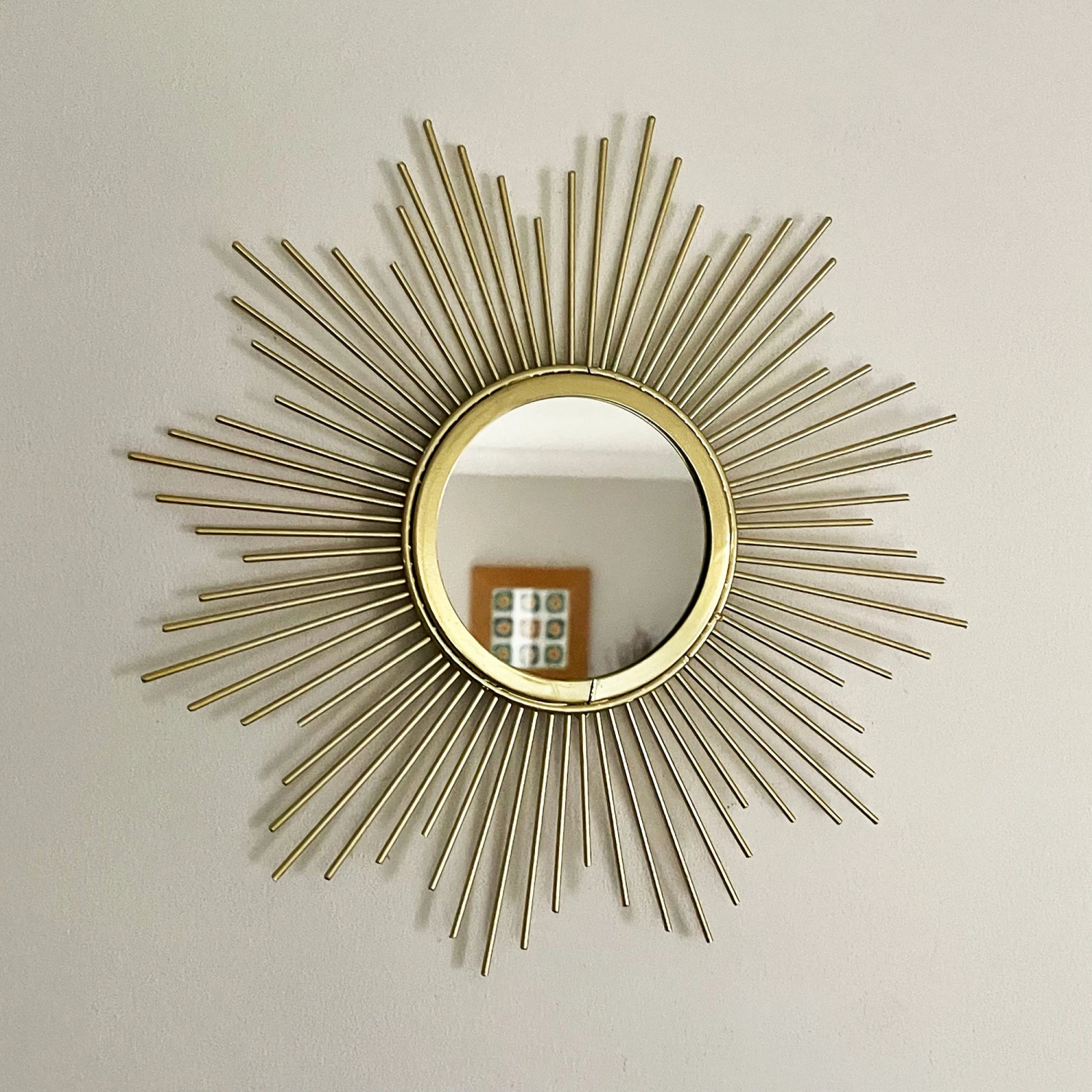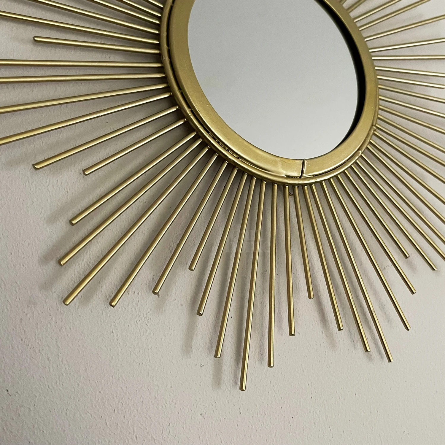 This beautiful small wall mirror boasts a gold sunburst design and 10cm round interior mirror which be a focal point of any bathroom. It is wall mounted and lightweight making it a perfect item for the living room. The frame is made from metal with a glass round mirror to its centre.