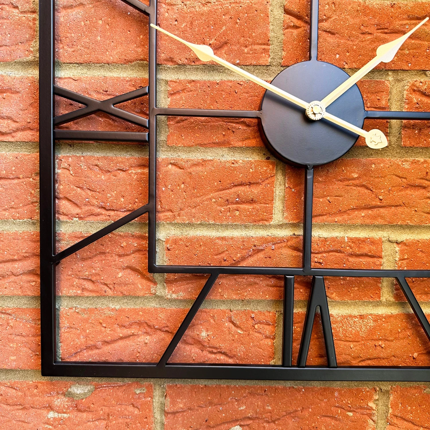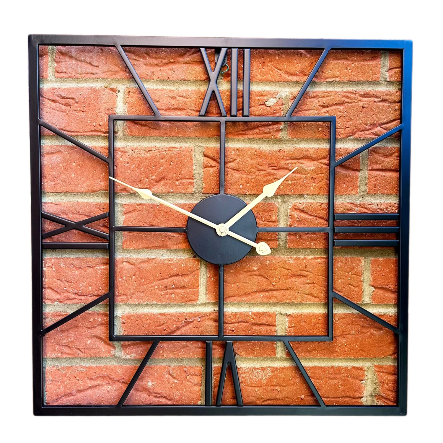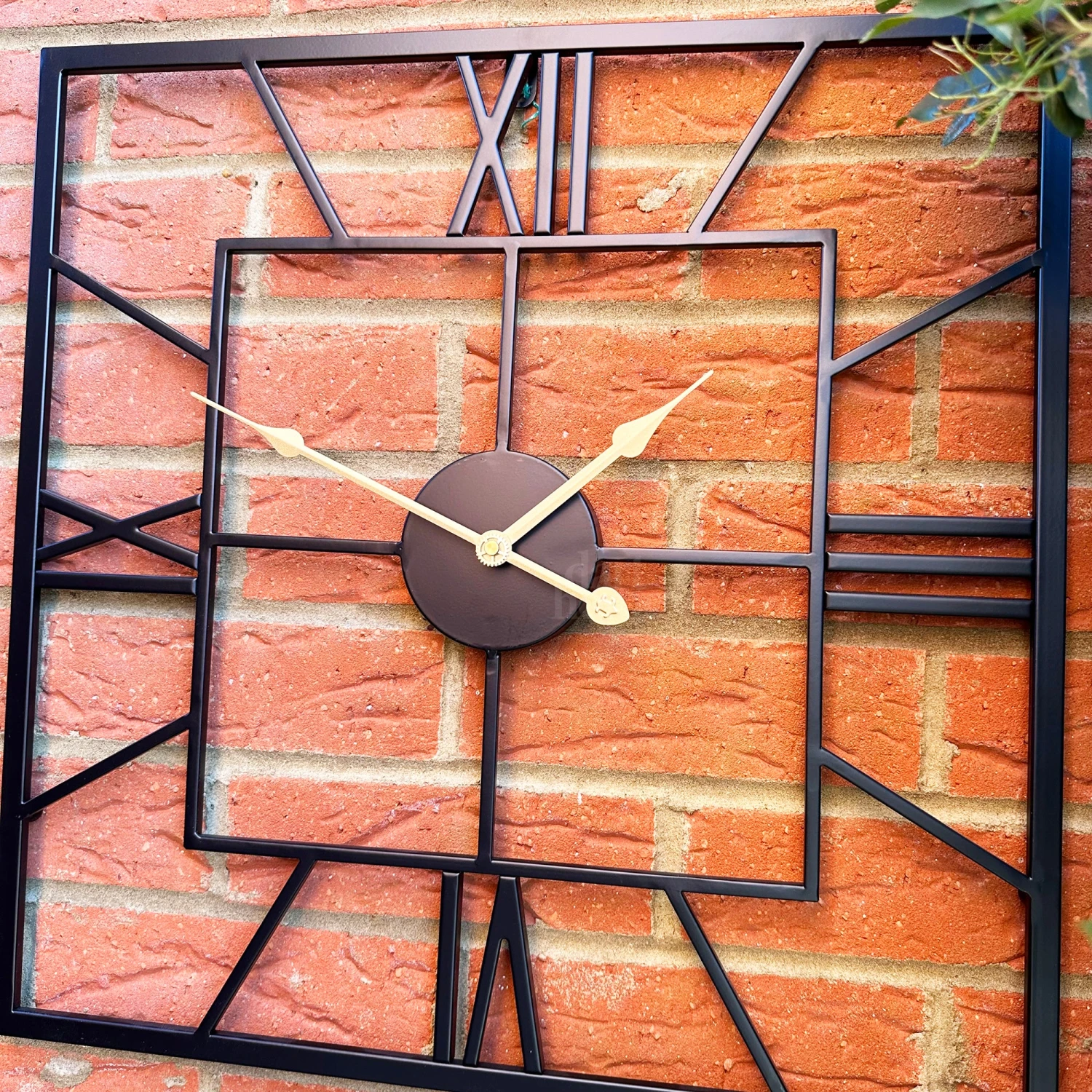 Keep track of time even when you’re outdoors with our modern silhouette outdoor wall clock, boasting asquare skeleton movement design. This battery powered garden clock features a roman numeral display and shiny golden hands to add a modern touch. This clock is suitable for year-round outdoor use.