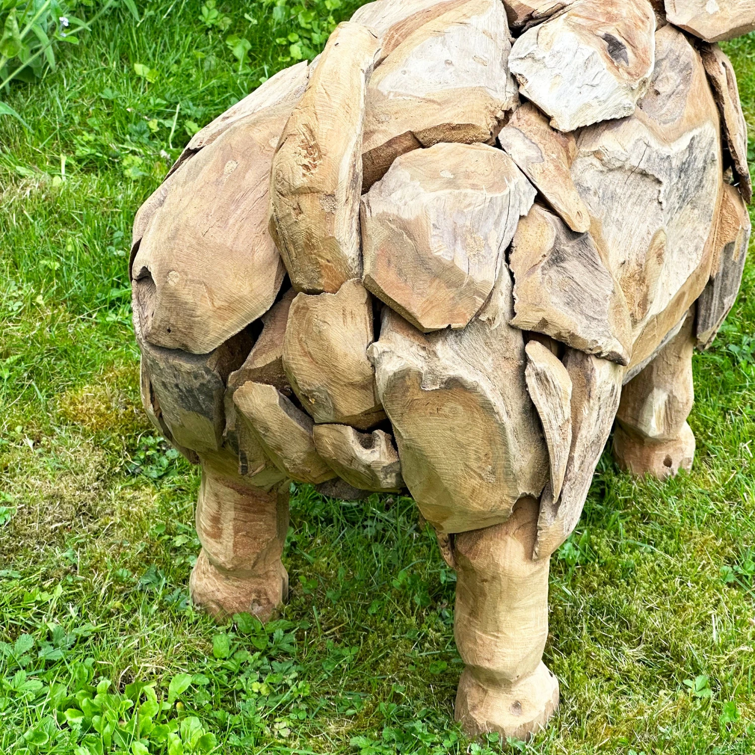 This extra large teak root-crafted pig sculpture is guaranteed to be the star of your garden decor. Hand-carved with intricate details, this little piggy will be the perfect addition to any home, adding a unique and fun touch of whimsy! Oink oink!