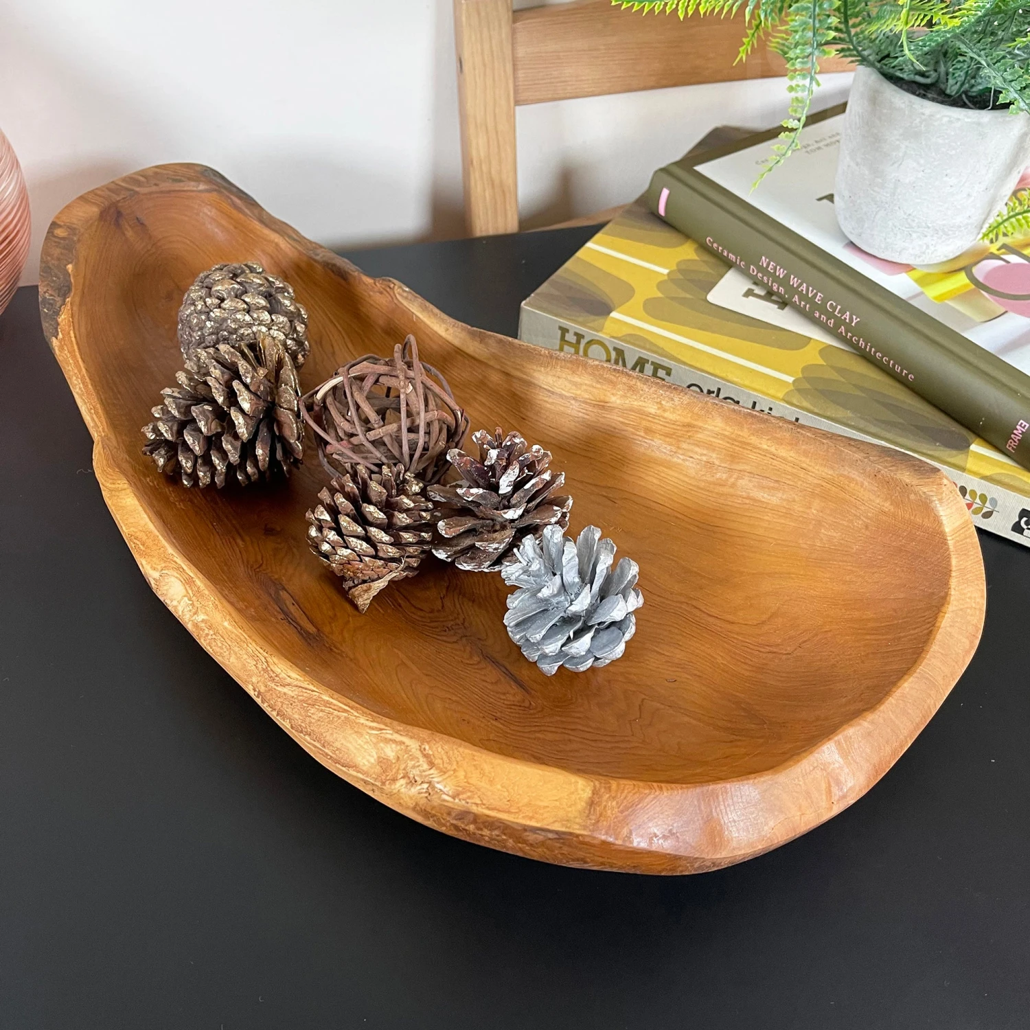 Add a vintage touch to your next get together. This beautiful root wood long bowl is ideal for fruit and for decorative purposes.