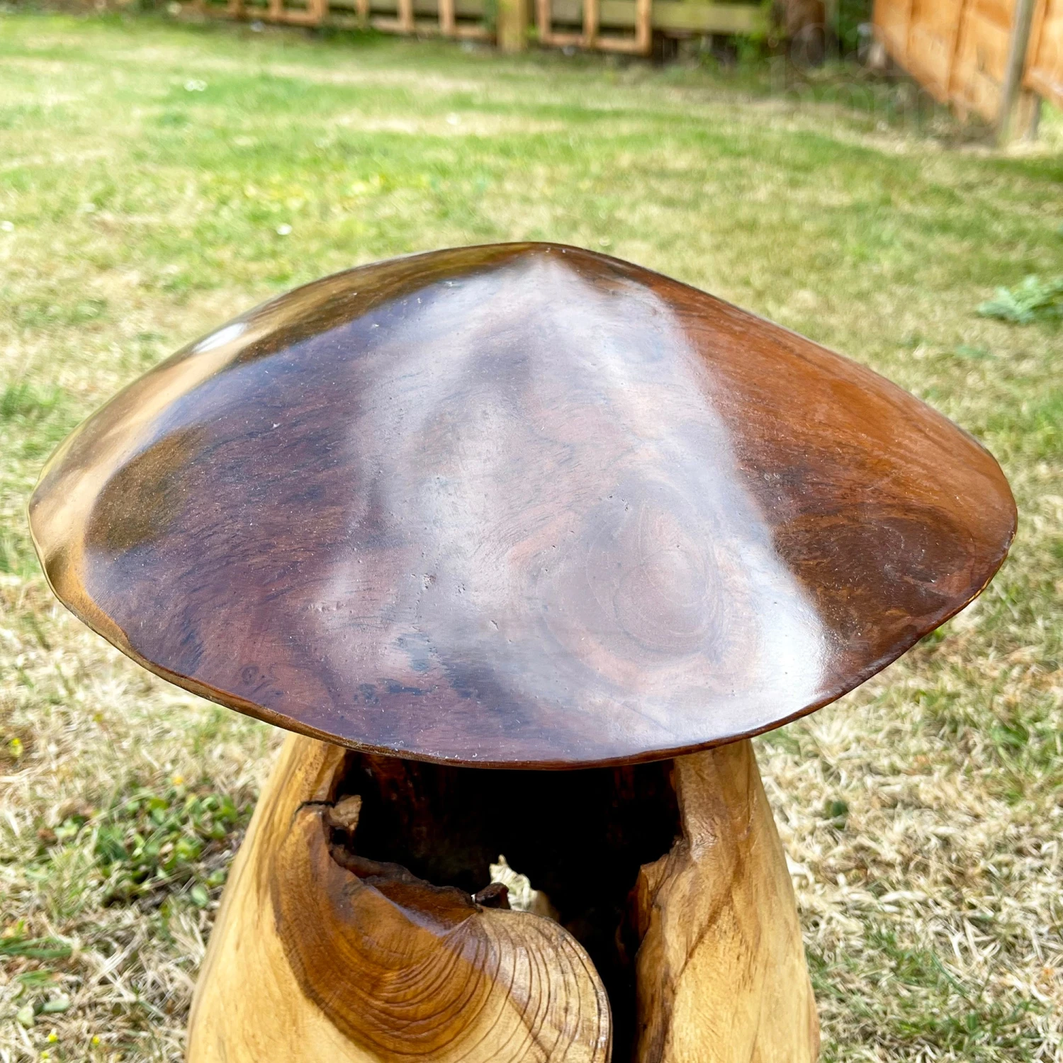 A hand carved rustic mushroom made from recycled teak root wood with a smooth rounded top. This large heavy toadstool decoration is an outdoor piece suitable for year-round ornamental use that sparks natural rustic style into your garden.