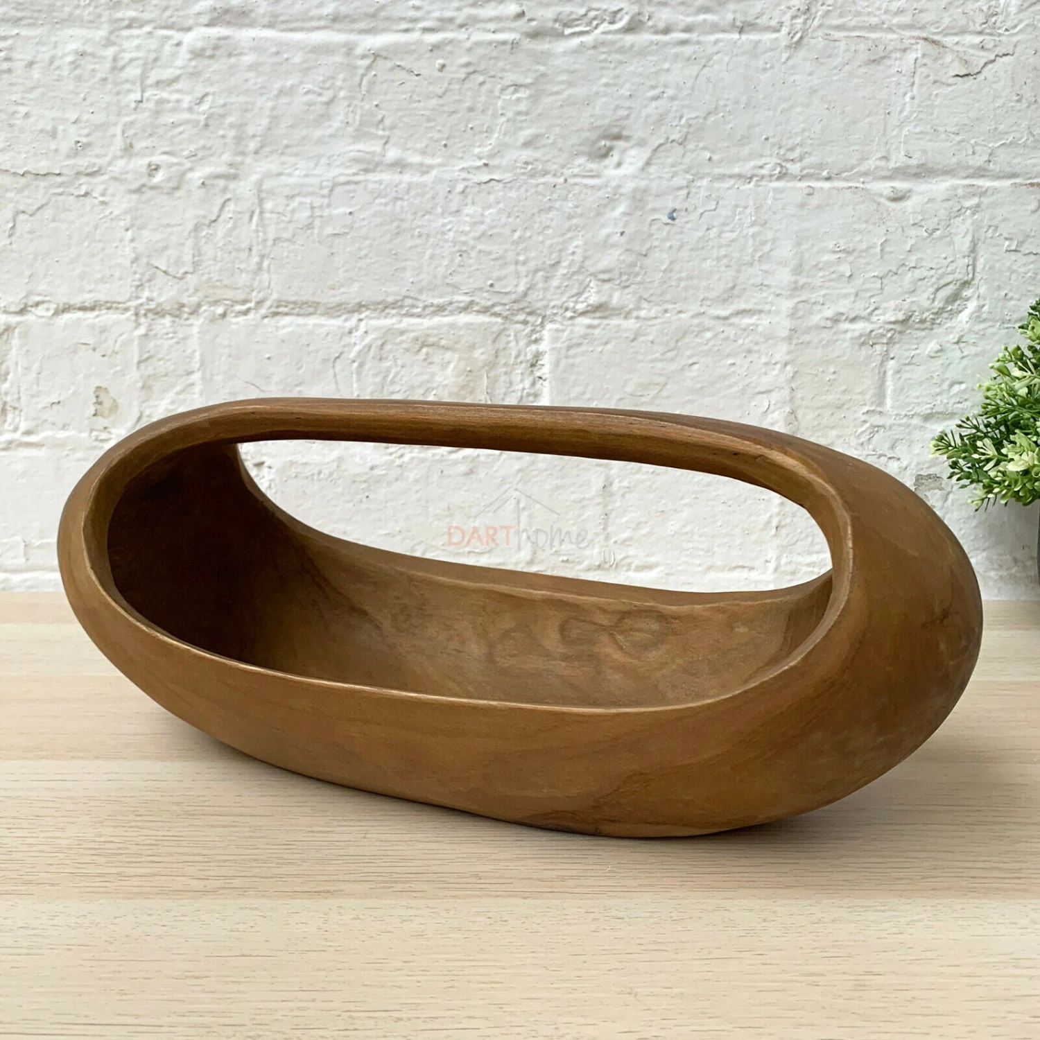 Add a vintage touch to your next get together. This beautiful large smooth root wood indoor long trug bowl is ideal for fruit and for decorative purposes. This piece is handmade using natural solid teak root dark brown finished wood from Bali, Indonesia.
