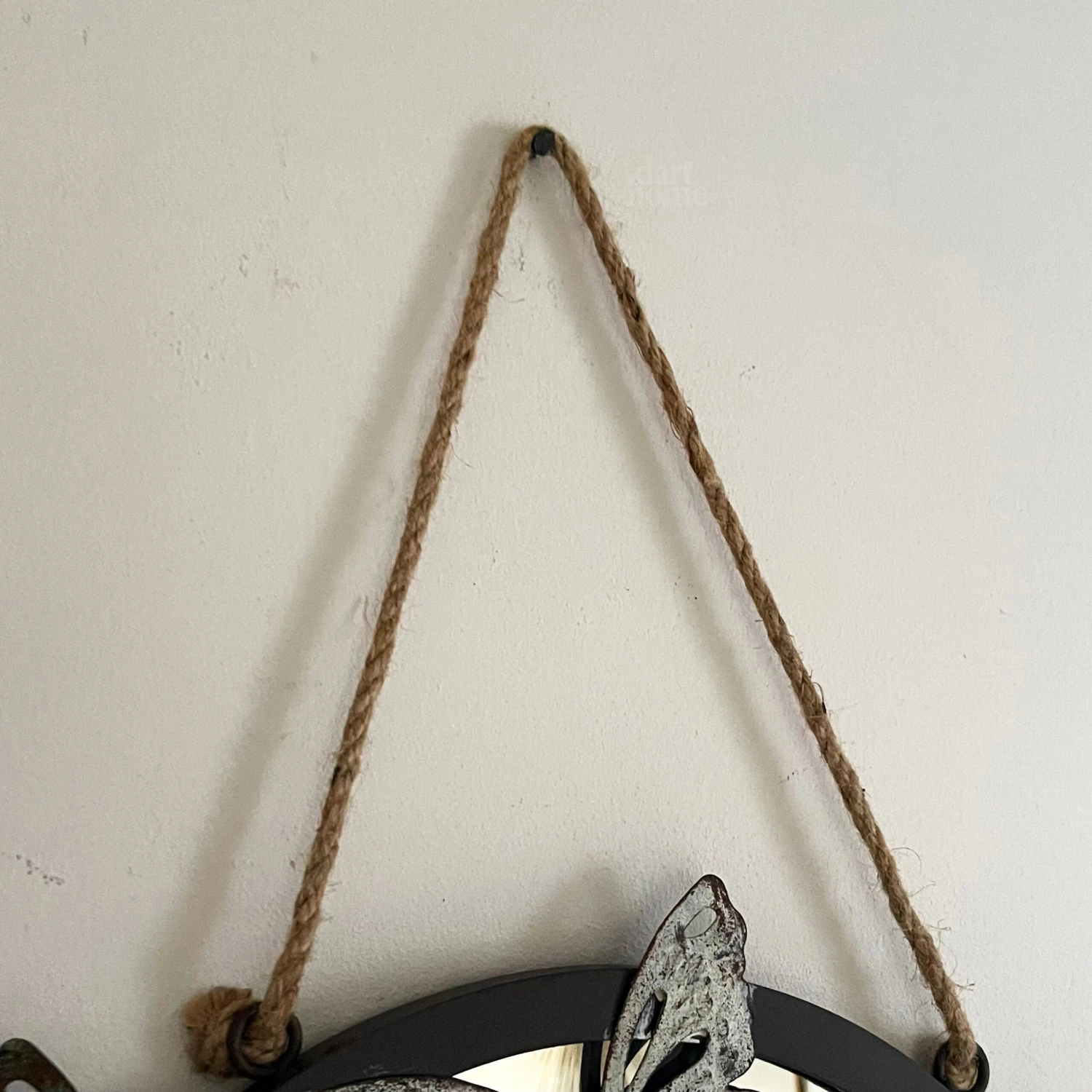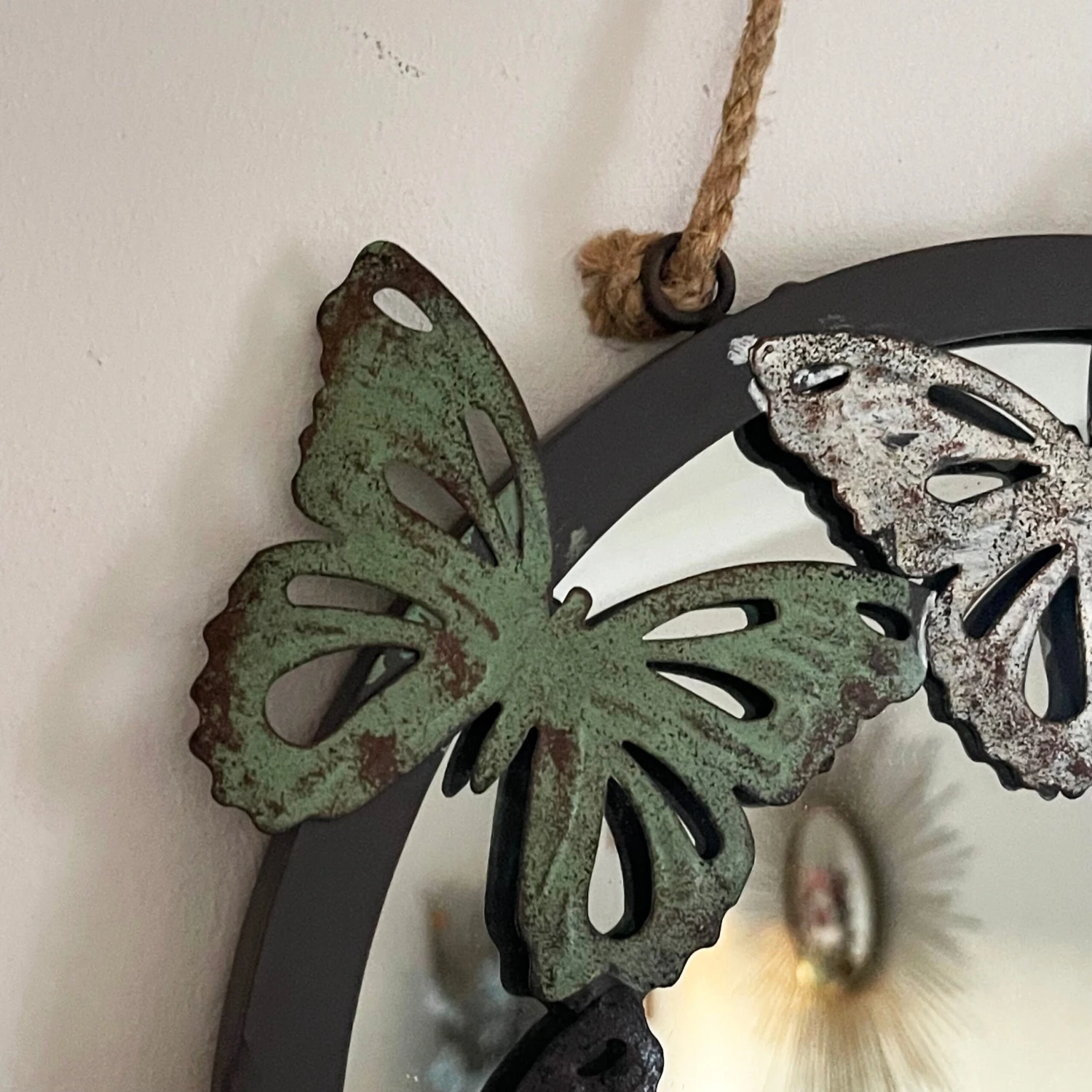 Round 26cm diameter wall mirror in a classic 32cm diameter butterfly trio design frame. Brown metal frame with distressed metal butterfly decorations around the frame, completed with a rope hanging to freely hang on any wall. Great for hallway or bedroom decorative use.