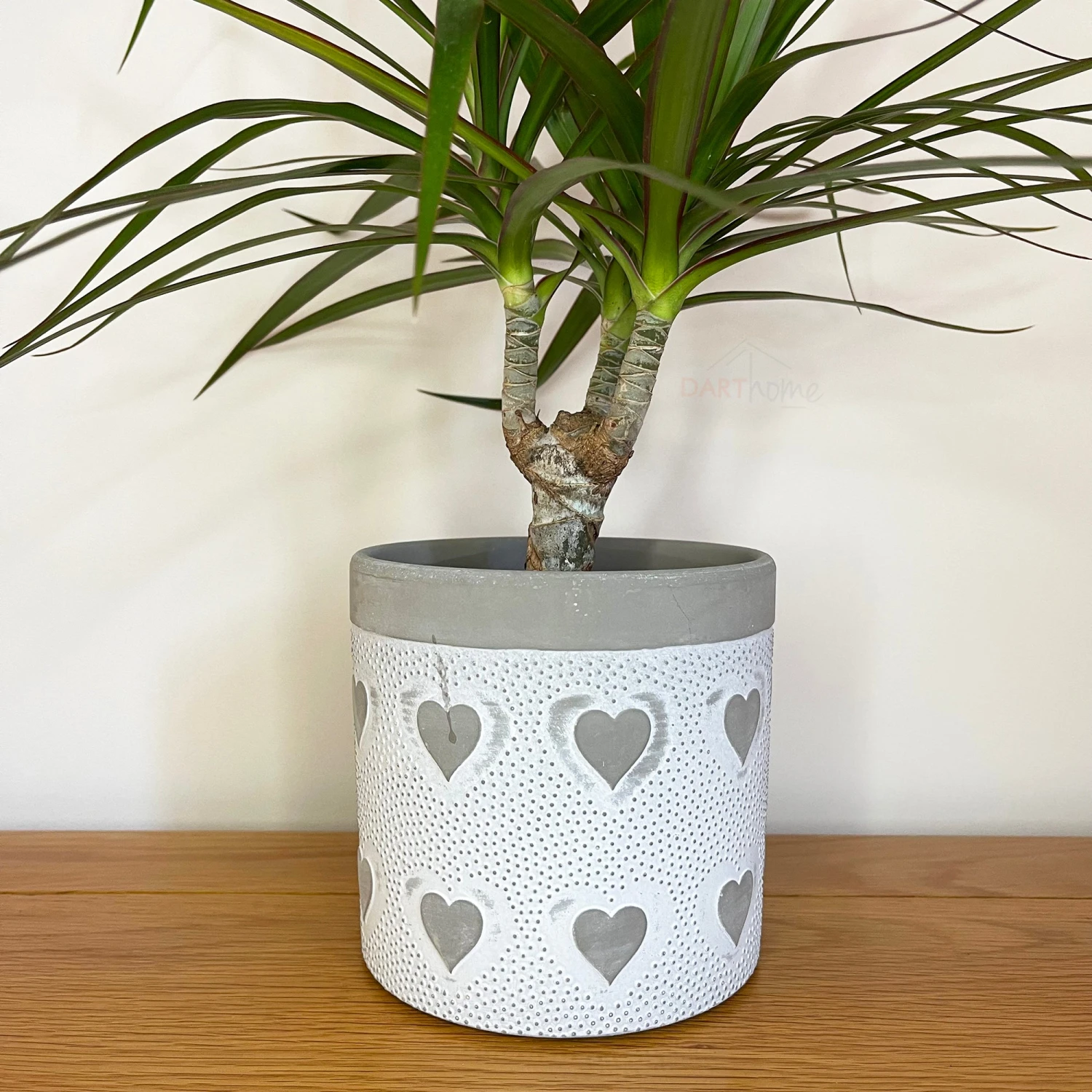 This unique love heart planter, made from cement is perfect for your home or as a decorative garden ornament. This design is filled with dark grey spots and love hearts around the pot with a white body.