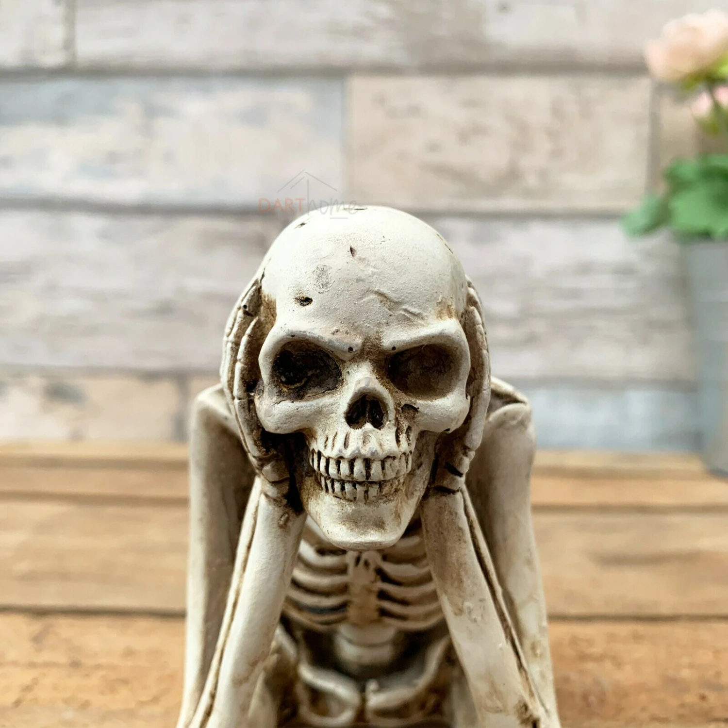 This novelty 20cm tall skeleton ornament comes in the design hear no evil. They are a shelf sitting product, made from resin in a white finish. Perfect decoration for halloween.