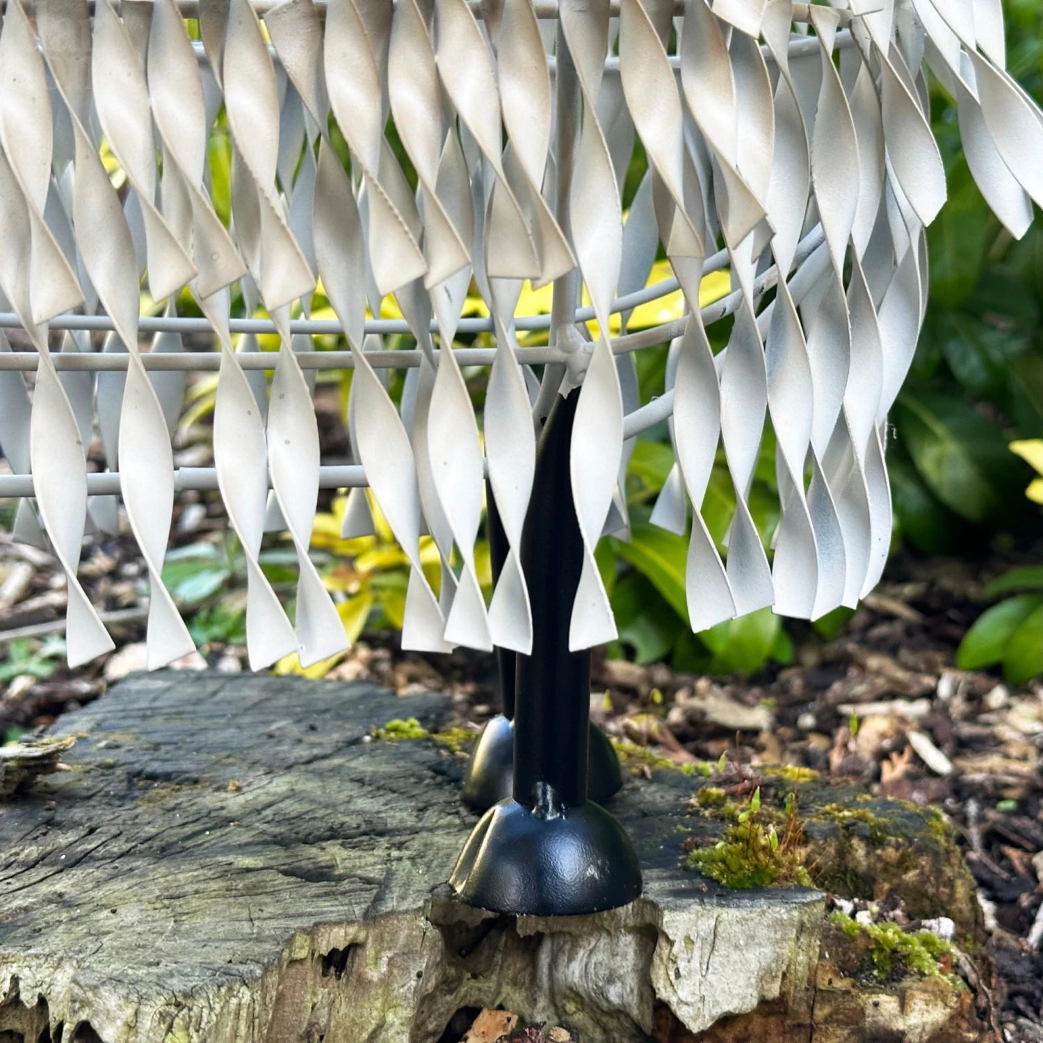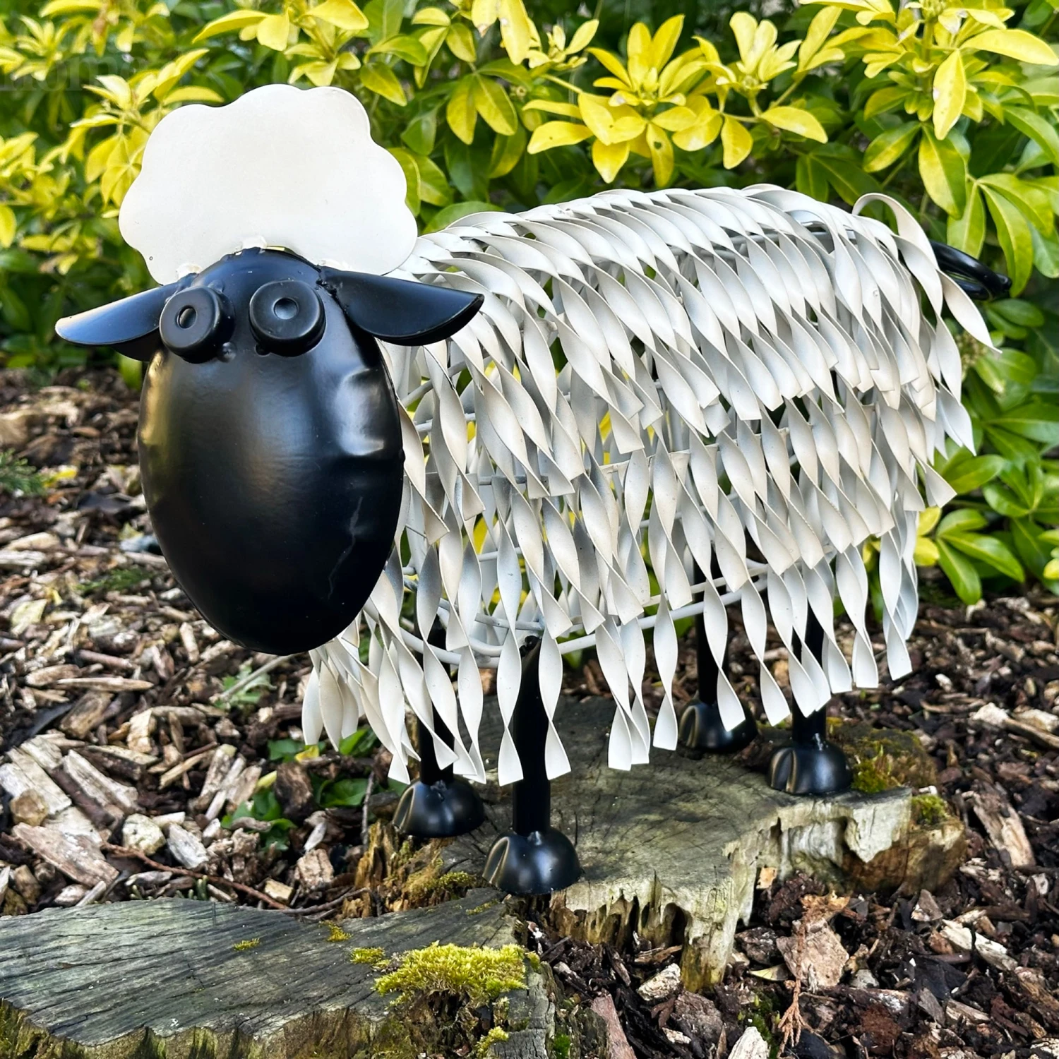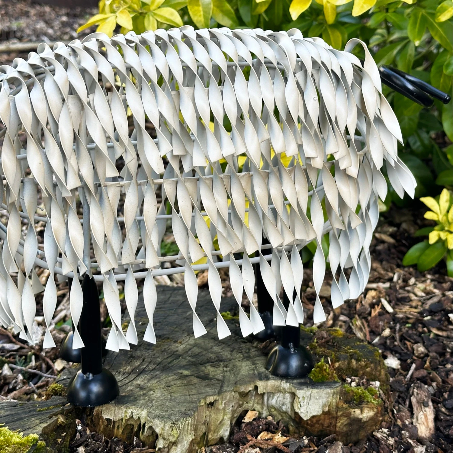 This metal hand painted sheep ornament is hand painted white on the body and black on the face and legs. It is stringed pieces of metal through the body that make this product so unique and it would look great in the garden of your home. Please note that this product may weather slightly over time.