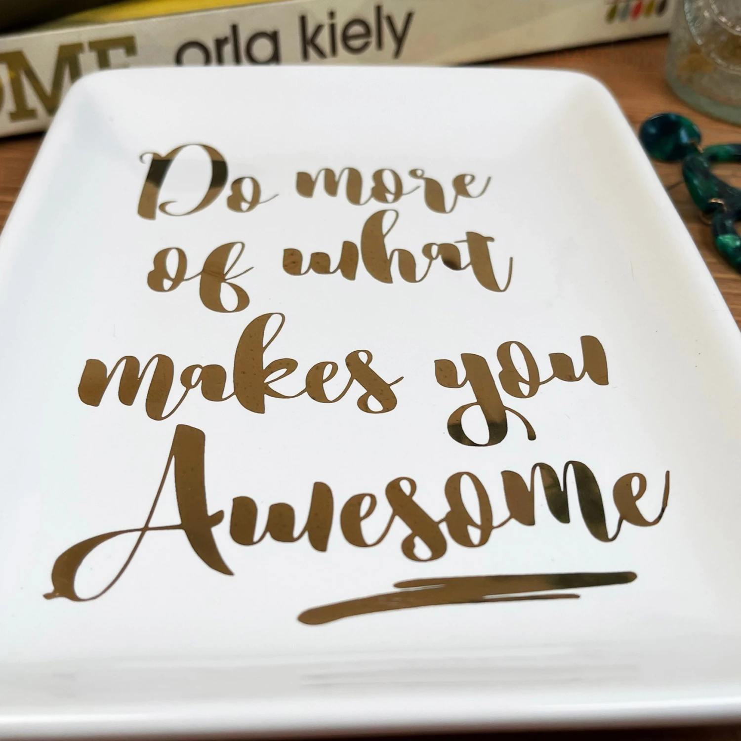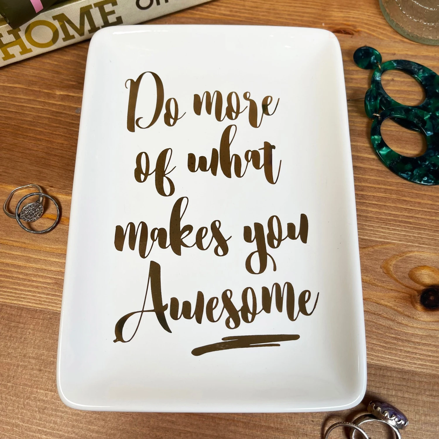 Add inspiration to your bedisde table and home with our new ‘Do more of what makes you awesome’ ceramic trinket dish in size large. Written in bold gold typography that pops on the clean white coloured base. A rectangular dish that will perfectly hold and store your jewellery and other little treasure you want to keep safe.