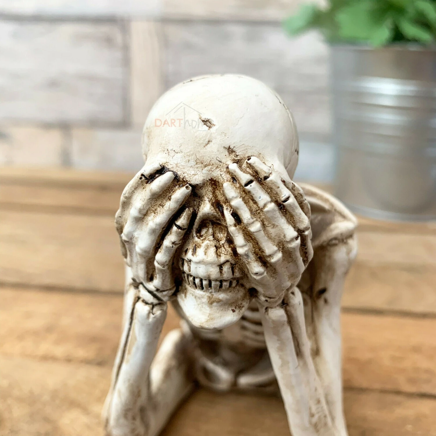 This novelty 20cm tall skeleton ornament comes in the design see no evil. They are a shelf sitting product, made from resin in a white finish. Perfect decoration for halloween.