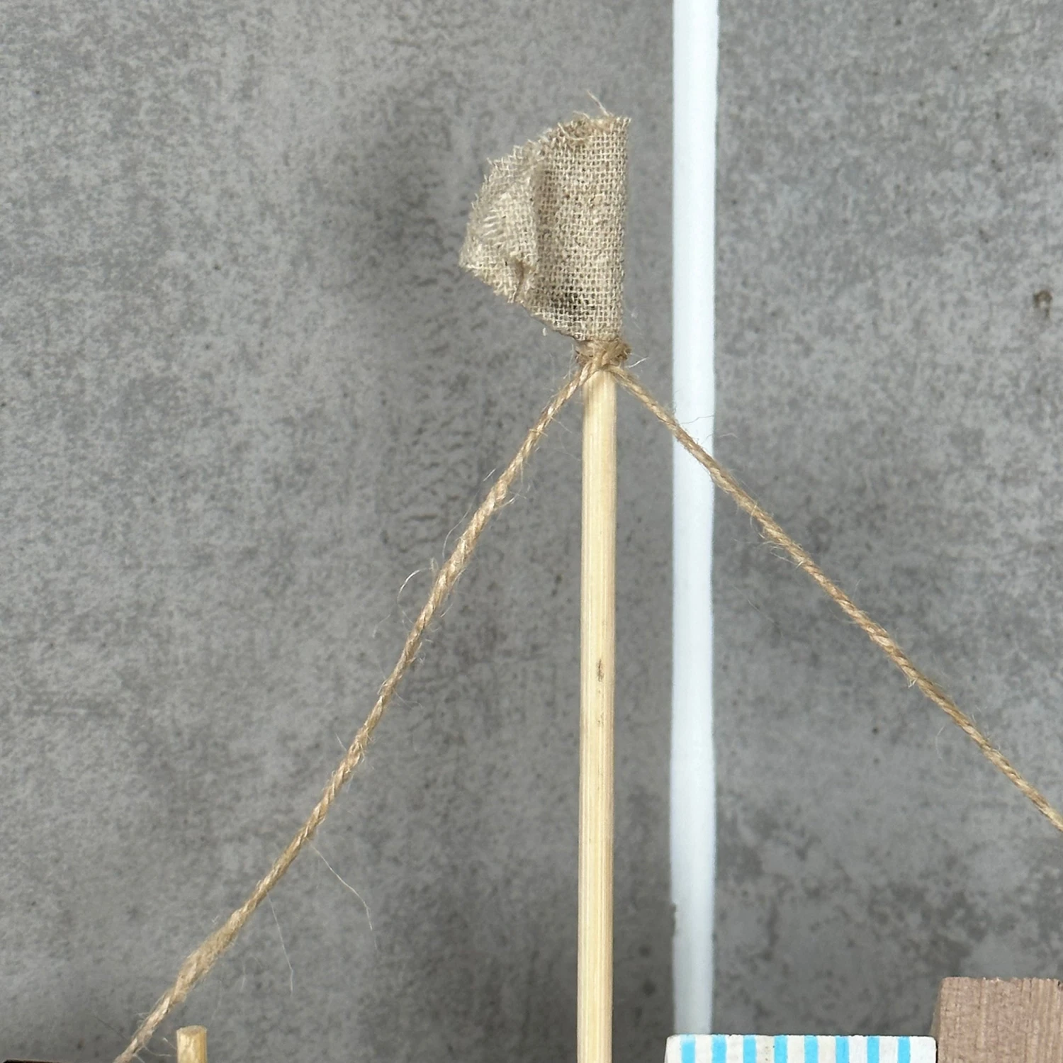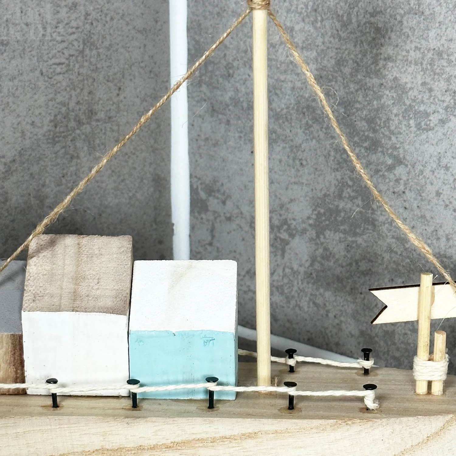 A nautical wooden made Atlantic Coast Boat featuring three brown boat houses. This ornament comes with a beach arrow sign along with string and canvas sails. It is a perfect sculpture for your bathroom nautical decor.