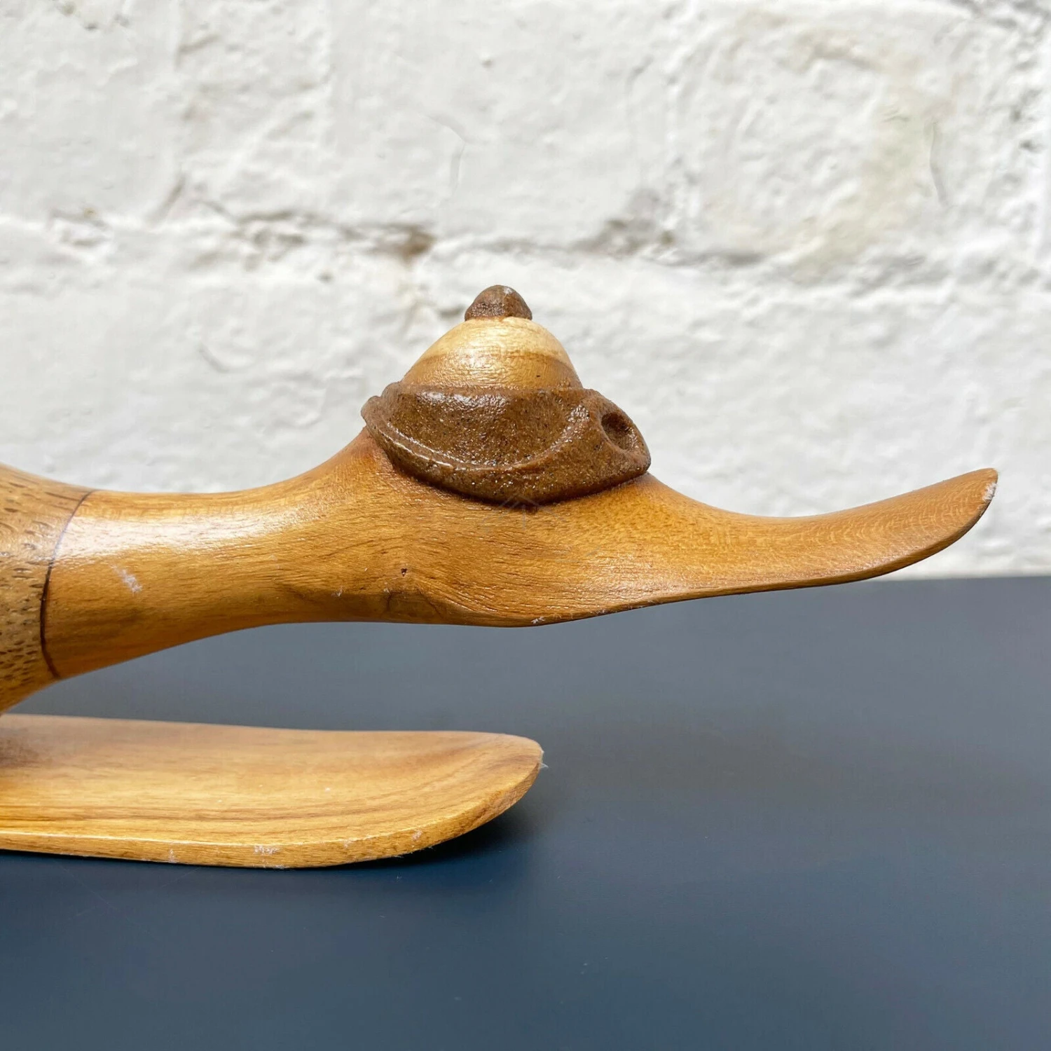 Natural finish snowboard duck laying down. This fantastic large wooden duck is 36cm long. It is a great shelf sitter that would sit perfectly in the home or garden.